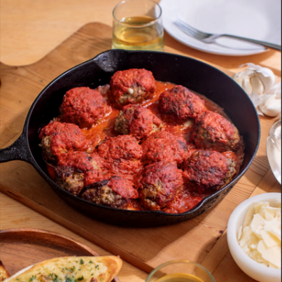 These delicious meatballs are just the ticket for a low effort appetizer or main dish! Form meatballs from a blend of ground beef & ground pork, panko breadcrumbs, parmesan and aromatics around mozzarella pearls for a cheesy center. Bake with Frik & Frak "The Sauce" until bubbly and fragrant. Toast TGM baguette and bathe in garlic butter for the perfect accompaniment!
