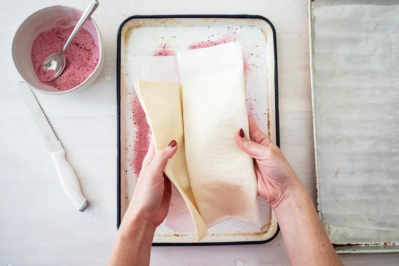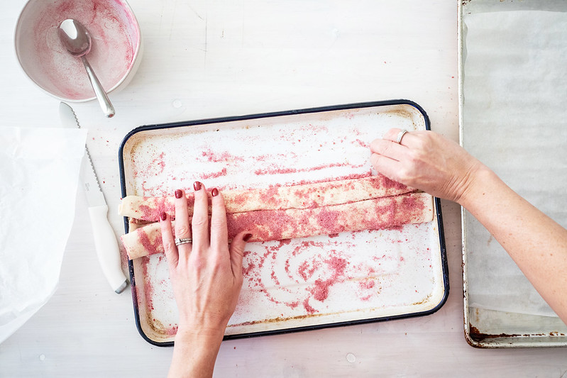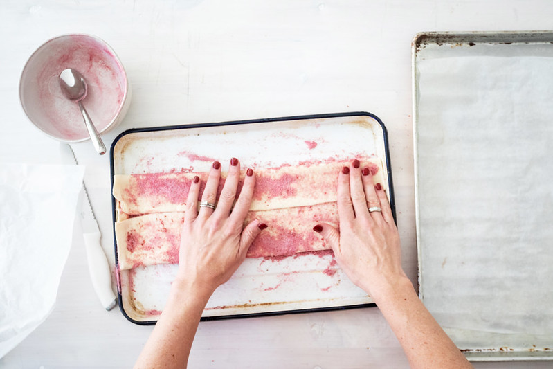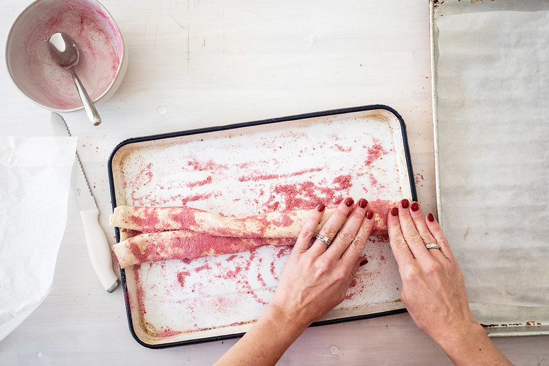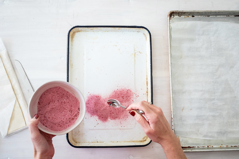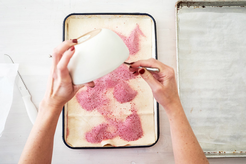 - Spread HALF of raspberry sugar on a work surface (this is messy, so doing this on a second sheet pan is helpful)