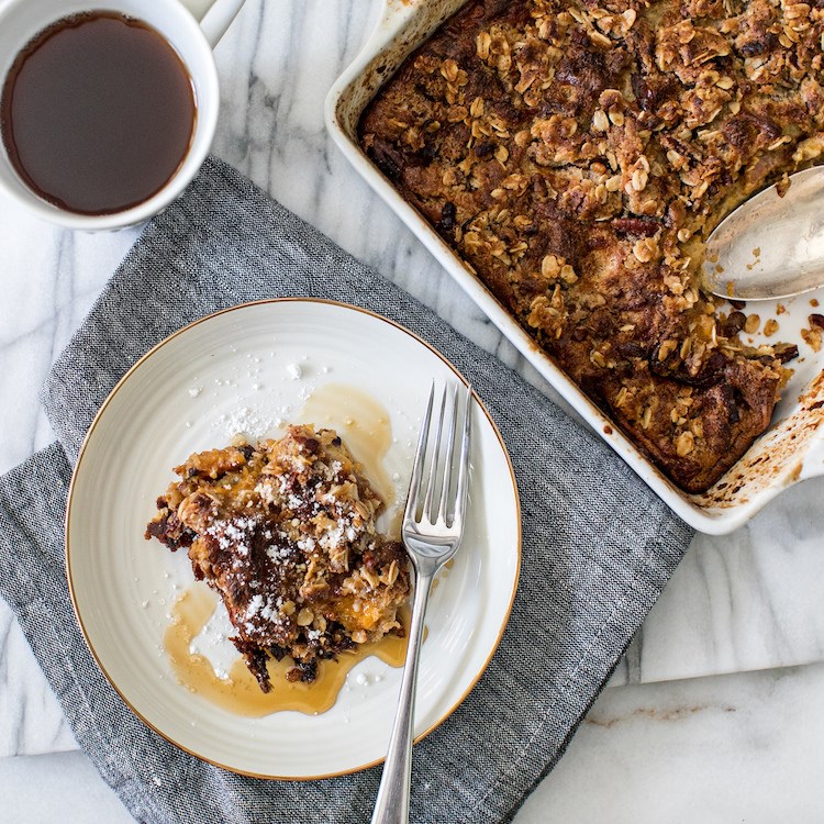 Start your day off right with the tantalizing smell of sizzling Pine Street Market bacon, featured in this yummy spin on French toast. You'll toss slices of TGM Bread's soft brioche with half & half, and Rise 'N Shine Farm eggs, then combine with bacon & cheddar cheese. Top off with a crumble of pecans, oats & brown sugar and bake to golden perfection, then drizzle with maple syrup for a sweet finish.