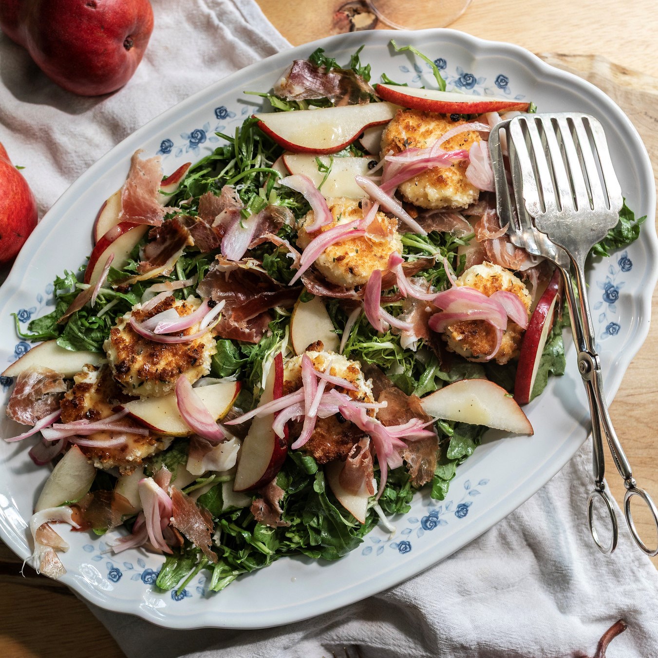 This elegant and delightfully autumnal salad features CalyRoad goat cheese formed into disks, coated in panko & walnuts, then sautéed until mouthwateringly golden and crispy. Toss together frisée & peppery arugula with a balanced apple cider vinaigrette for the base of your salad. Top with Pine Street Market's smoked prosciutto, thinly sliced sweet red pears, quick-pickled shallots and your fried goat cheese.