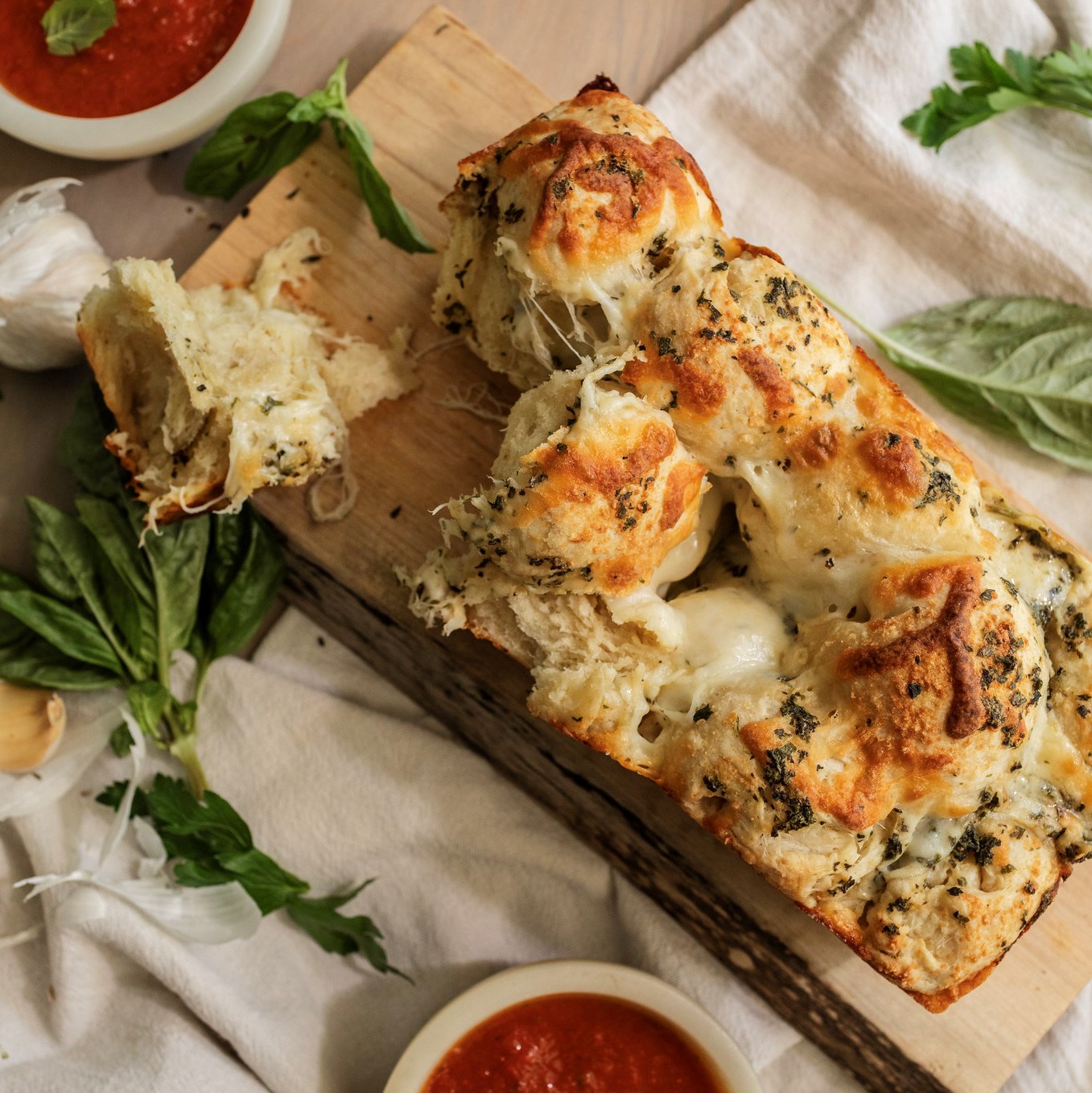 This pillowy soft, herbaceous pull-apart bread is a delicious, shareable appetizer for game day or any time (although after one taste, you might find sharing difficult)! Whip up an easy enriched dough, then form into rolls. Coat dough balls with melted garlic-herb Banner Butter and layer with melty mozzarella & parmesan in a loaf pan, then bake until golden. Garnish rolls with a sprinkle of parsley and enjoy with Frik & Frak marinara sauce for dipping.