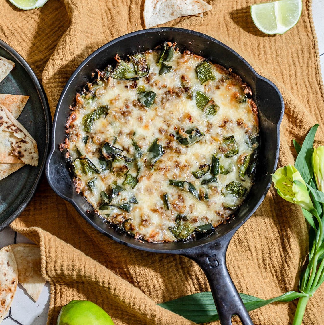We take the legwork out of making queso fundido so you can have all of the *fun* and none of the fuss! Brown Pine Street Market's Mexican chorizo then sauté diced poblano pepper & aromatics. Stir in melty Monterey jack & quesadilla cheese, then bake to bubbly, browned goodness. Garnish with fresh cilantro then serve with crispy oven-baked corn tortilla chips sprinkled with G&G's own Ancho Lime "Ob-Zest" spice blend.