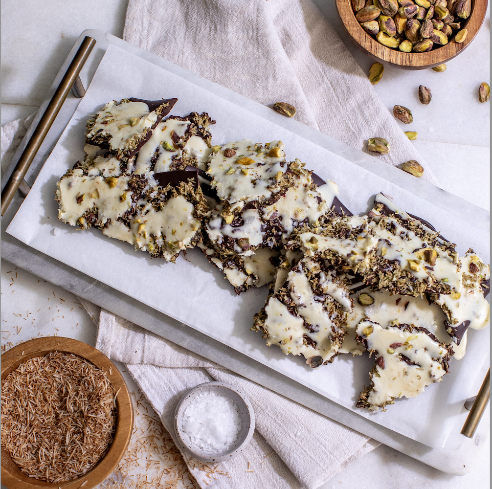 The G&G take on Dubai chocolate! This delectable dark chocolate bark is topped with pistachio cream & crispy shredded phyllo, drizzled with white chocolate, and then sprinkled with crunchy pistachios & flaky sea salt. This decadent dessert is the perfect way to treat yourself or to spread some holiday cheer!