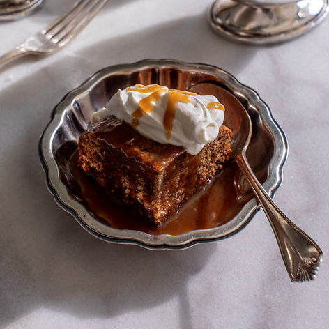 Make your own magical sticky toffee pudding studded with dates and smothered with a decadent, homemade bourbon toffee sauce. Enjoy warm topped off with a generous spoonful of whipped cream, then sit back & bask in the light of your pudding-making prowess!