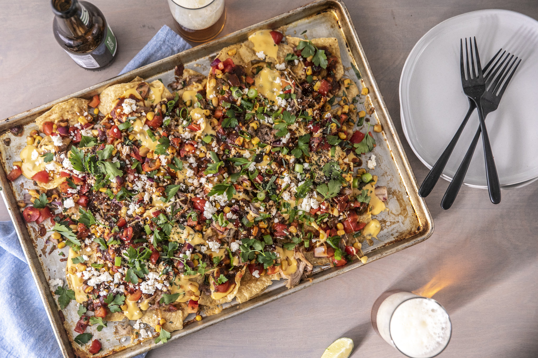 The G&G team is wild about these nachos–and they're perfect for game day snacking! Melt cheese with a dash of Sweet Auburn's signature BBQ sauce & pickled jalapeño for a dead-simple and deliciously gooey queso. Pile tortilla chips high with smoked pulled pork and shredded cheddar, and broil until melted. Top it off with your queso, Sweet Auburn's corn pico, queso fresco, scallions, and a drizzle of BBQ sauce.