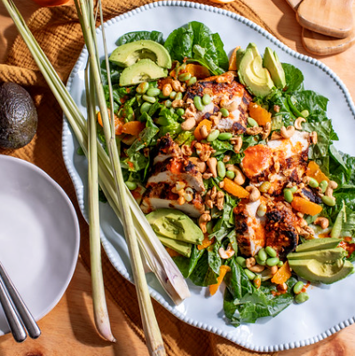 Start off the new year with fresh flavor! Toast cashews in warm coriander, cumin & ginger then in the same pan cook Springer Mountain chicken breasts bathed in fragrant lemongrass to juicy perfection. Make a crave-able vinaigrette with red curry paste, fresh garlic and lime. Assemble your salad over a bed of crisp romaine with nutty edamame, sweet mandarin and creamy avocado. This salad is colorful, delicious, and perfect for a fresh start!