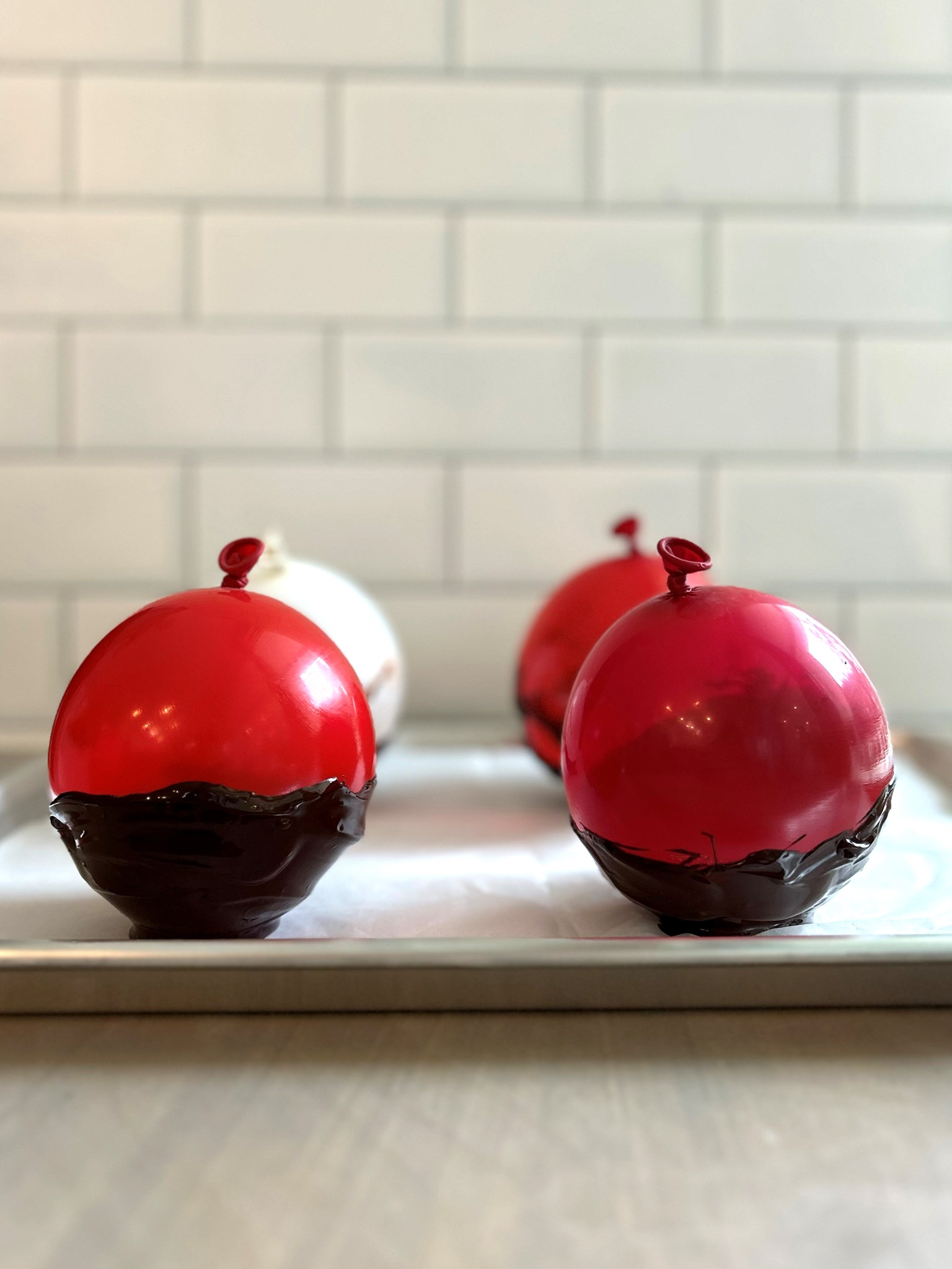 Once hardened, use scissors to gently cut a small hole near the top of the balloon knot, allow the balloon to slowly deflate and carefully remove the balloon from the shell. Fill with mousse and top with raspberry coulis, and enjoy!