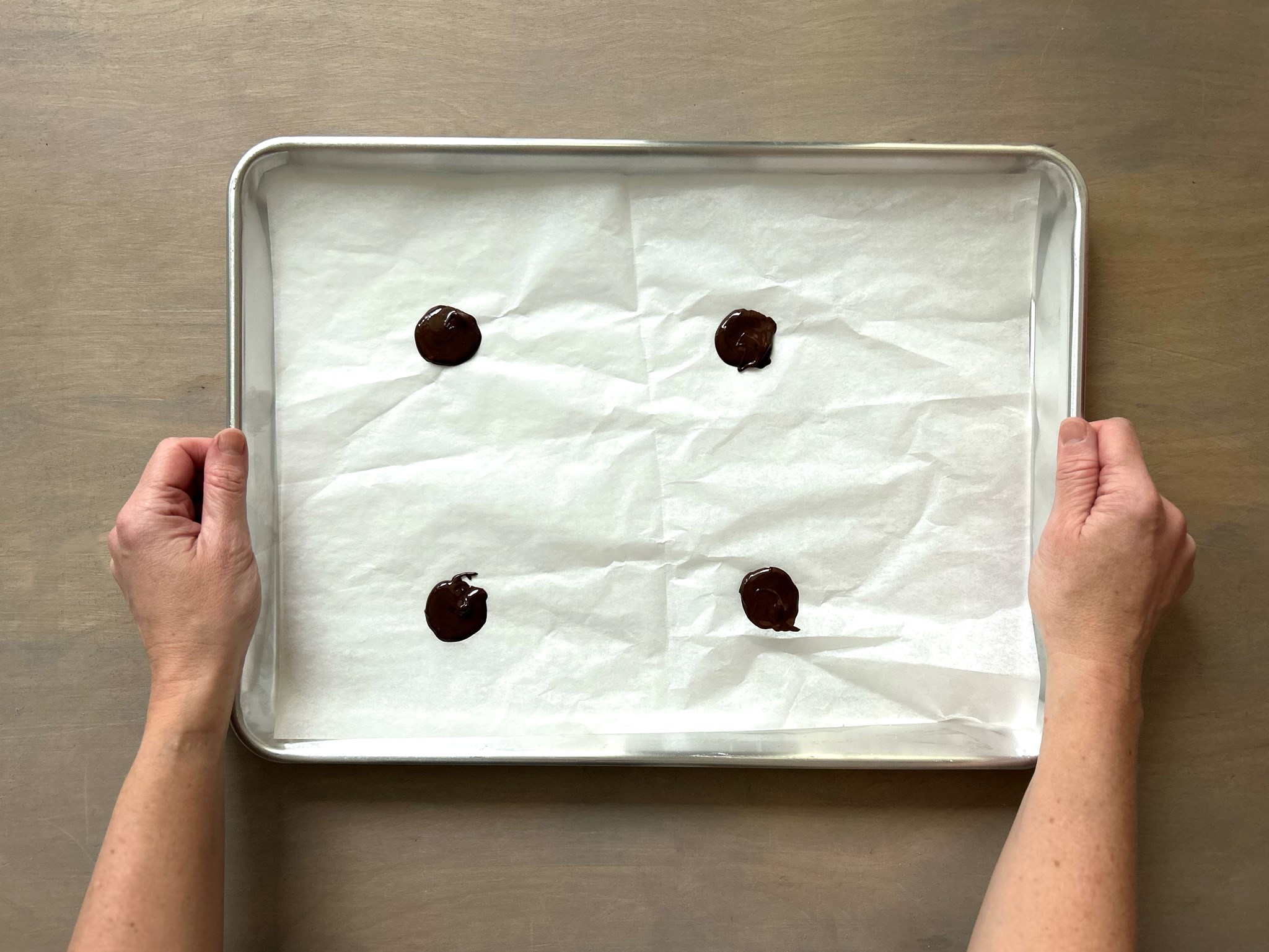 Line a baking sheet(s) with parchment, then spoon a small amount (about 1/2 tsp) chocolate in 4 corners of the lined baking sheet for the base of the cups.