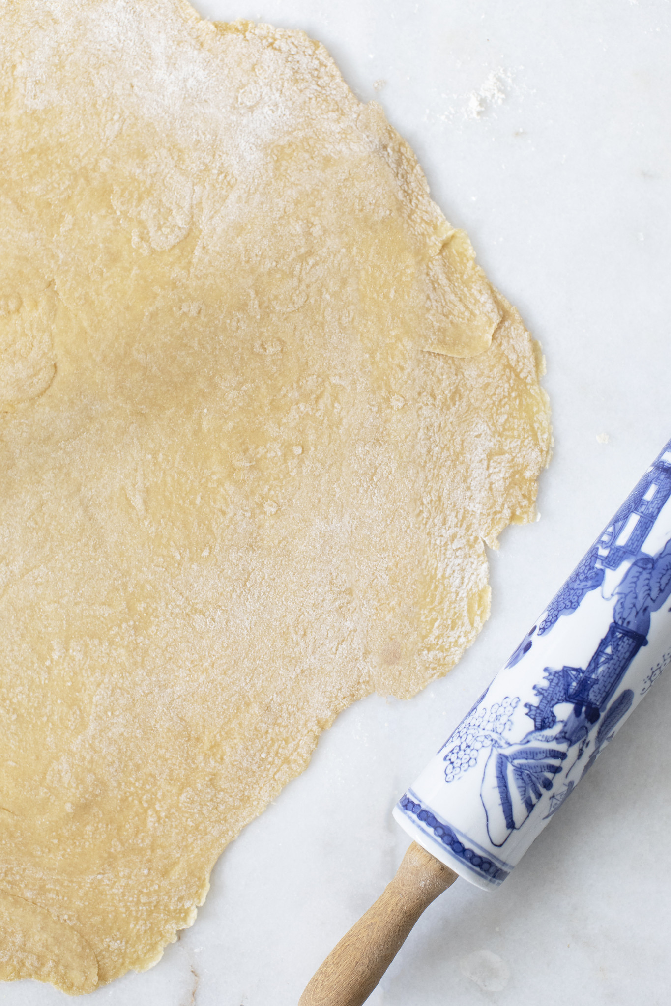 When you're ready, remove dough from the fridge and from plastic wrap. Flatten into a disc with your hands, then, on a floured surface, use a rolling pin to flatten the dough further. Roll out until your dough is thin and even, about 1/16 of an inch thick. You may need to sprinkle flour on your dough from time to time as you're rolling it out if it feels sticky.